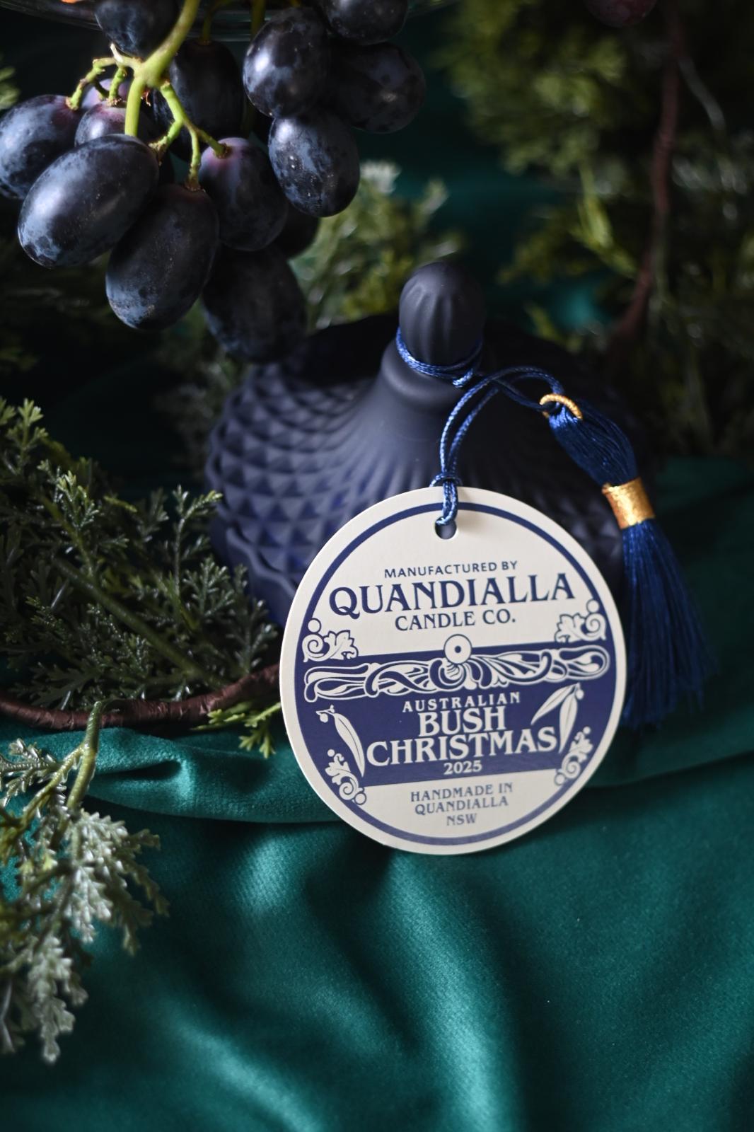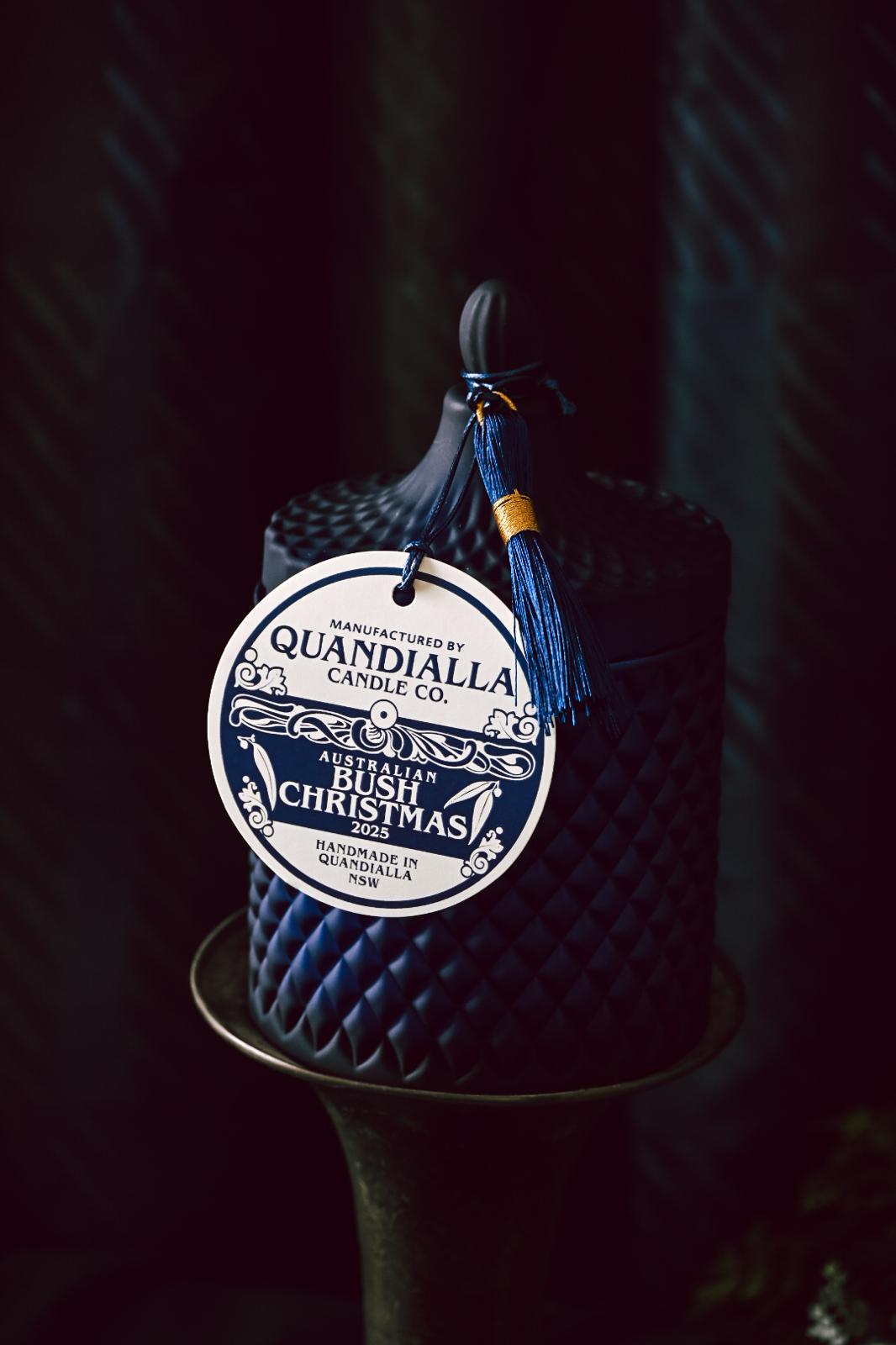 Presented in a large (500g) navy blue geometric glass jar with lid, and a navy silk tassel with the 2025 swing tag. Comes securely packaged in a pastel blue round gift box with a navy sticker label. Tie it up with a navy ribbon or gold cord for your gifting to your loved ones (or for adding to your Quandialla Candle Co collection!)